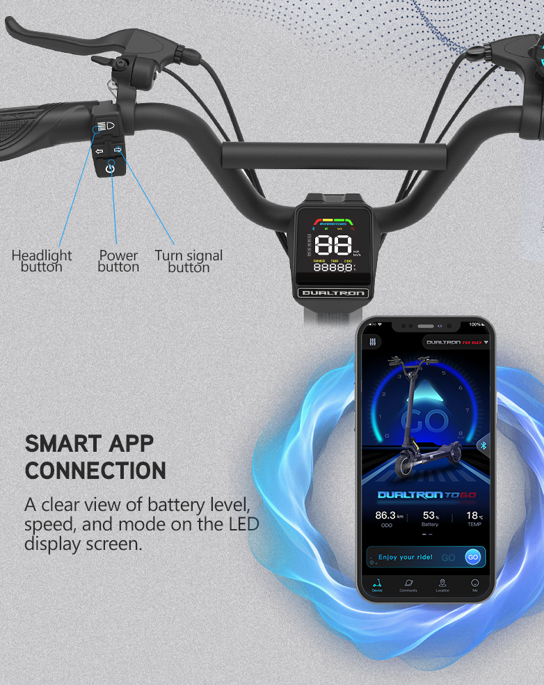 Cette trottinette Dualtron possède un tout nouveau design. Nous avons reprit les lignes sportives de la Dualtron Mini et le côté robuste de la Dualtron Pop pour dessiner ce modèle. La DT Togo est ainsi très moderne, dans un style très urbain. Vous aimerez notamment l’écran central, le repose pieds arrière ou encore le revêtement silicone du deck.